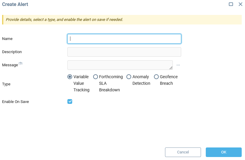 Anomaly Detection — Triggers an alert when atypical or anomalous variable values are detected. Configure the machine-learning module (or keep the default settings) and provide training data by uploading a dataset or selecting a time range from the variable history to train the model.