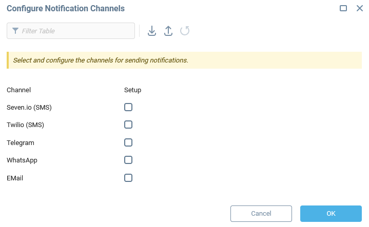 Enable one or more delivery channels if you need notifications. Supported channels include: Seven.io, Twilio (SMS), Telegram, WhatsApp, or e-mail.
