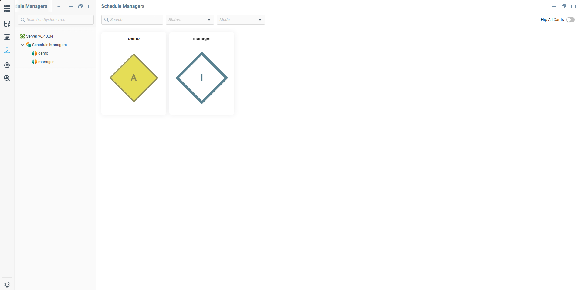 The dashboard also supports search and filtering across all Schedule Manager cards by status and operation mode, allowing users to quickly locate and access the relevant manager instance.
