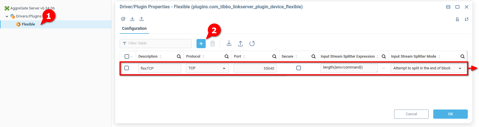 You have set the global configurations of the Flexible Driver plugin to accept TCP data on port 55040, decode the incoming data as US-ASCII text, and forward it to the Flexible Driver device with ID "1". The next section describes how to configure that device to process incoming messages.
